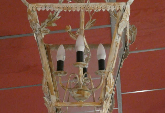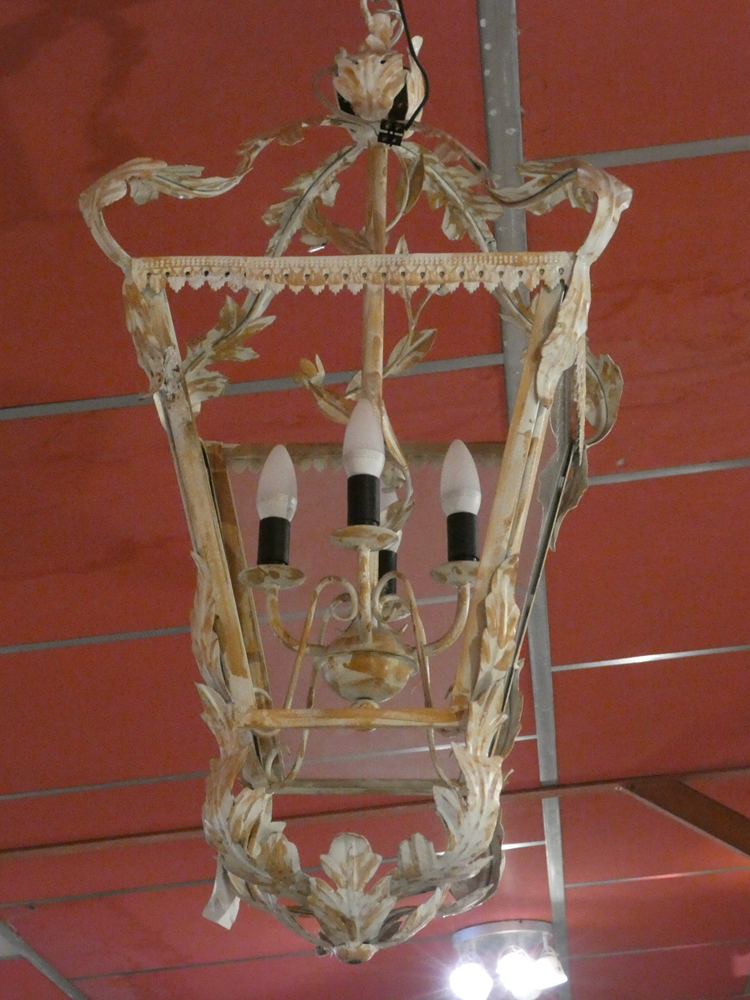 Plafonnier en fer Hauteur: 110 cm Dimension haut: 40 cm x 40 cm Dimension bas: 23 cm x 23 cm Prix: 280€