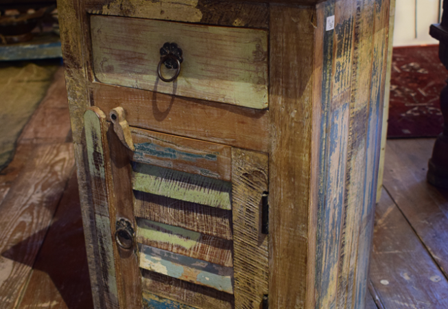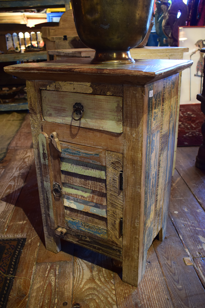 Chevet réalisé avec du teck recyclé. Hauteur: 64 cm Dimension du plateau: 44 cm x 33 cm Dimension du corps: 36 cm x 29 cm Prix: 300€